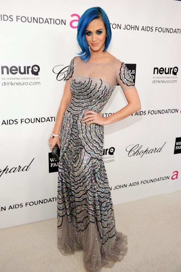 Katy Perry added her own blend of kooky cool to this ’20s style Blumarine dress with her new blue bob. The sheer panelling adds a more sophisticated edge to this fun and party perfect frock. Imagine it under disco lights, hello gorgeous glitter ball!