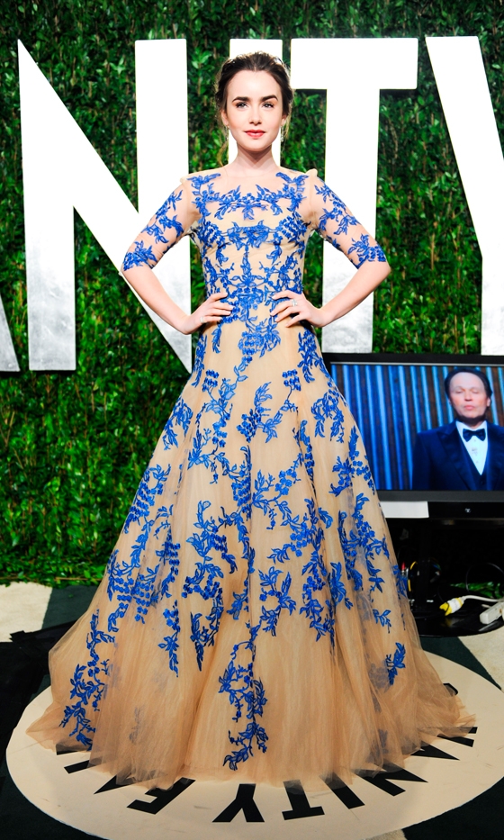 Finally Phil Collins’ gorgeous daughter Lily stepped out in this Monique Lhuillier gown that screams ‘princess’. Usually these full skirted frocks are the ones I find least appealing on the red carpet, but there’s something I love about this look, she almost reminds me of Disney’s Belle. You can see why Lily is perfect to play Snow White in upcoming film Mirror, Mirror, that gorgeous pale skin sets off this dress perfectly and creates a gorgeous contrast with the bright blue embroidery. There’s something a little Kate Middleton about it too, I could imagine our Kate sporting this at an official event, so it definitely has princess credentials.