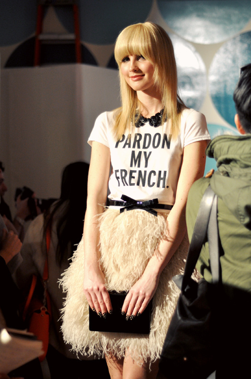 An antidote to the previous image now and we’re going a bit more prim with this look from the Kate Spade collection at New York Fashion Week. Kate’s designs are always so cute and this t-shirt has stolen my heart. I say we’re going more prim, but then again if I owned this tee, I’d probably wear it with jeans and a messy Kristen hairdo, a la the previous image or grunge it up Mary Kate and Ashley style (they’re on the way in this post don’t worry!) mixing high fashion with more worn in pieces.