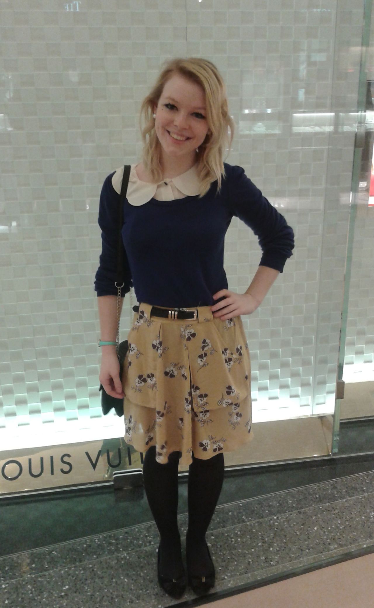 So I’m wearing a Primark shirt, tights, flats and bag, blue Topshop top that I absolutely love and have had for a shameful amount of years, River Island pansy skirt that I got in the sale for only £5, such a bargain, River Island belt, vintage pearl studs and my ASOS watch that was a present from my boyfriend and that I wear every day. A good, completely high street outfit right here and of course I got to wear my favourite colour, mustard! Anytime I can incorporate mustard into an outfit I am a happy lady. I wore my River Island coat over the top of this which you will have seen in my Venice posts, (click here to see that).