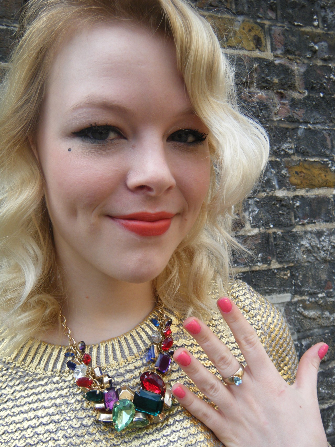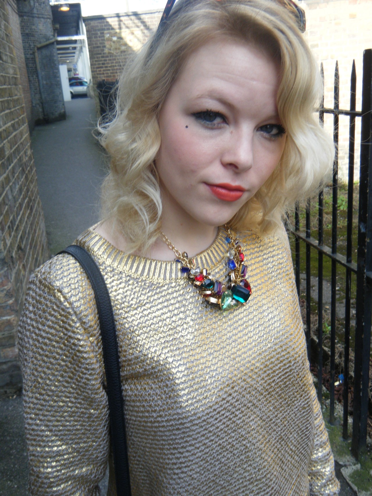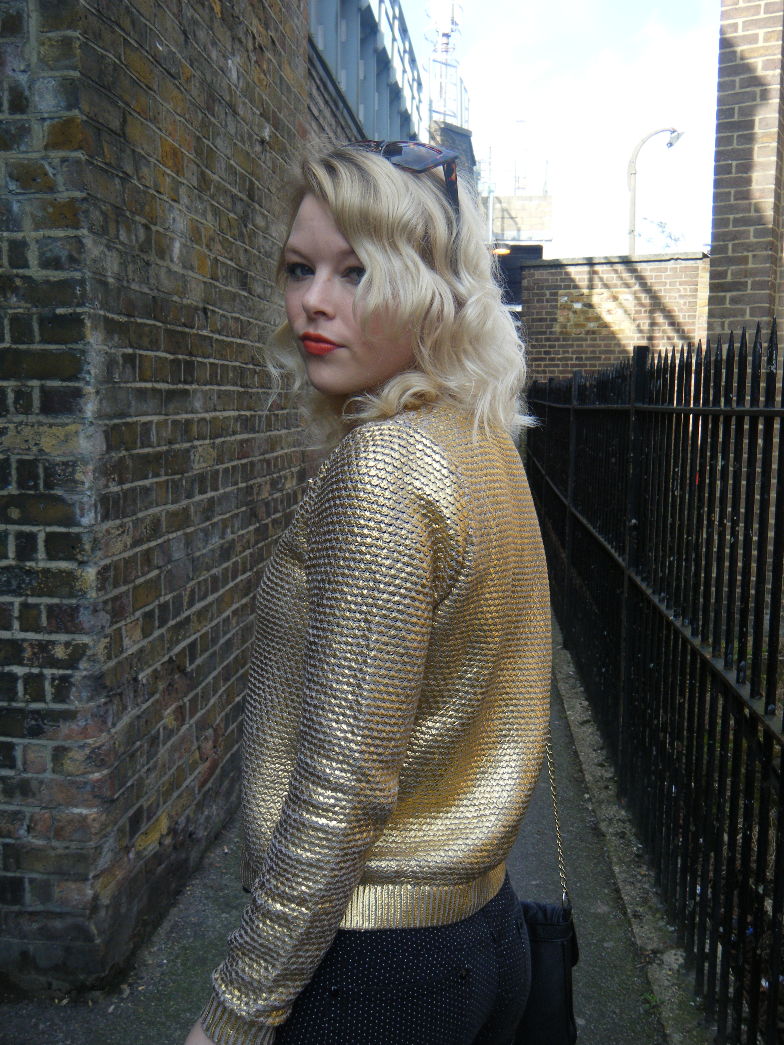 This is one of my favourite ever outfits, and I got tonnes of compliments throughout the day on it. Everyone was commenting on how striking the jumper is, and I utterly love it! I’m pleased to tell you that I picked up this gorgeous gold jumper for an absolute steal at £9.99 from H&M, you can’t say fairer than that! This has been in every H&M I’ve been in this weekend (and we went in about 5) so you shouldn’t have trouble locating it, and of course if you do want it, it’s always online too! I teamed this jumper with a H&M jewelled necklace which is one of my favourites, H&M ring, my Matalan polka dot skinnies which I’ve been living in at the moment, my new grey Converse, ASOS watch as usual, Primark bag and Claire’s Accessories glasses.