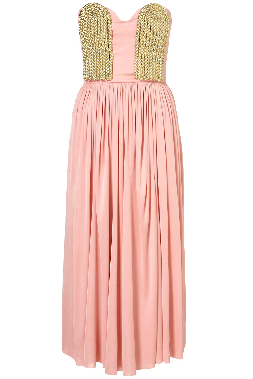 This is such a great dress for summer events that you might have coming up, and as Nic shows, you can wear it all year round so it’s a solid investment piece. The flattering strapless shape with nipped in waist is truly timeless so you won’t be looking at it in a year’s time and asking yourself ‘WHY!?’ as can happen with many on-trend pieces. Fitting in with this season’s penchant for pastels the soft pink works with neutral colours and other pastels for a fabulous clash and the gold detailing adds the perfect amount of glamour. Being as the Unique collection was centred around an Egyptian theme, you can even go global traveller with this and pair it with tribal accessories to dress it down or up for an instant holiday look.