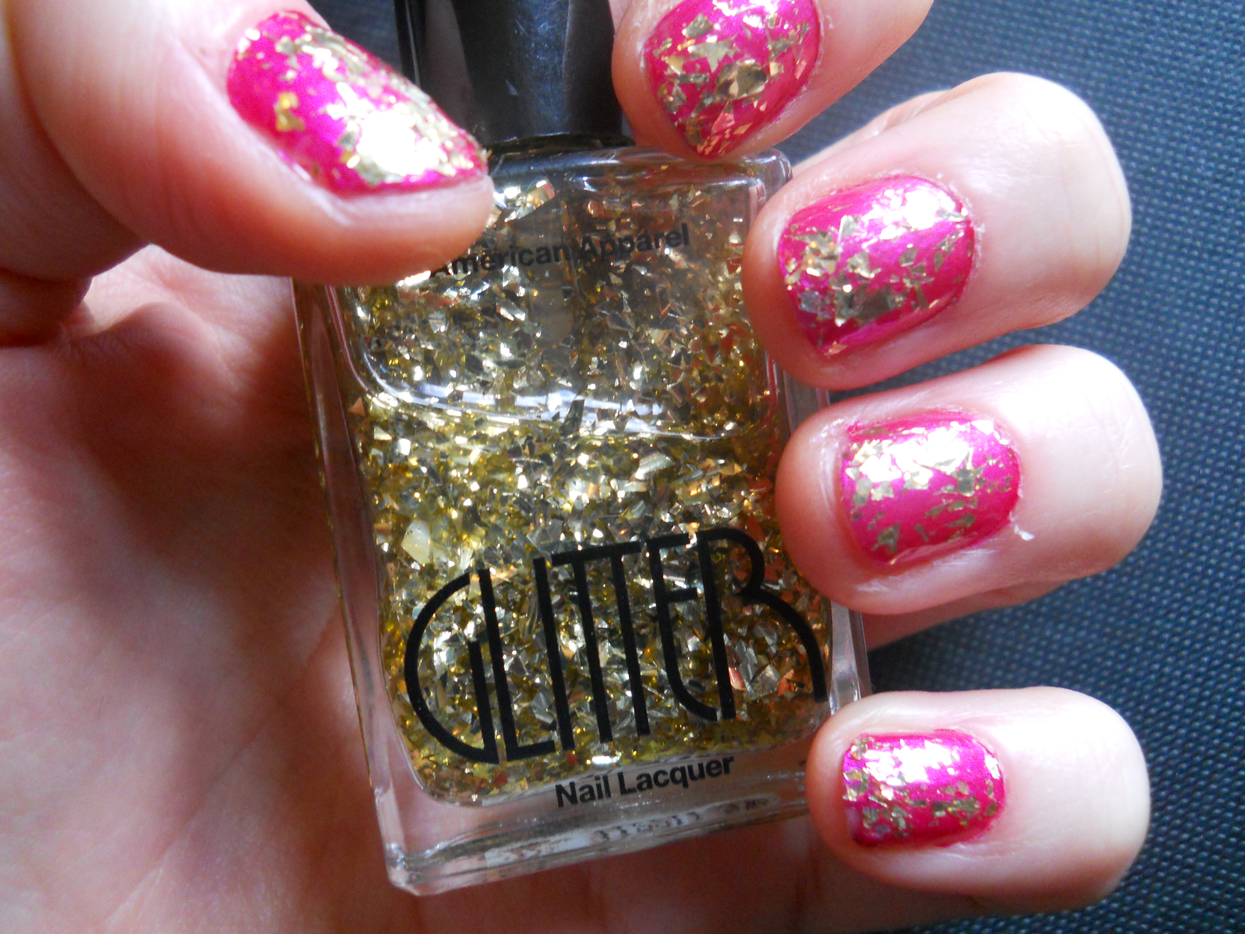 Number four this month is another glitter polish (hello problem) and it’s American Apparel’s Meteor Shower. This was recommended by Kate of Dolly Bow Bow on Youtube in a recent nail favourites video and I instantly bought it online when I saw it. It’s an incredible gold leaf effect polish that consists of a clear base with large ripped gold foil pieces in it. It wasn’t cheap at £9, which I consider pretty much extortionate for a nail polish, however it is a huge bottle and I know I’ll wear this manicure a lot. This weekend I wore Rimmel’s Shocker which is a bright magenta with about two or three coats of this polish over the top and I really loved the outcome, isn’t it fab?