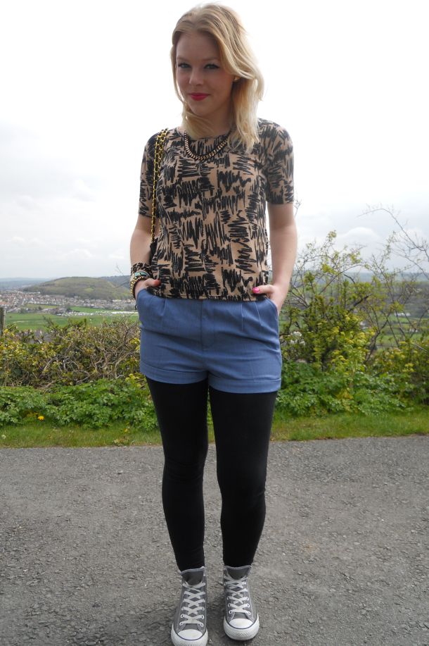 I’m wearing an amazing top from Primark which I am besotted with at the moment. I love the ’50s/60s style print on it, it really reminds me of something from Mad Men. With gold and black accessories I think that it instantly looks more expensive, and being as I only paid £5 for it, it’s pretty good going. I’ve teamed the top (which you’ll see in an upcoming prints post) with some summery shorts from H&M which are also currently instore and which I’ll be featuring in an upcoming summer basic posts too! The black leggings are from George at Asda, my converse are from Schuh and the bag which you can barely see is my new skull handbag from Max C London which I featured in my April Favourites (click here to see that).