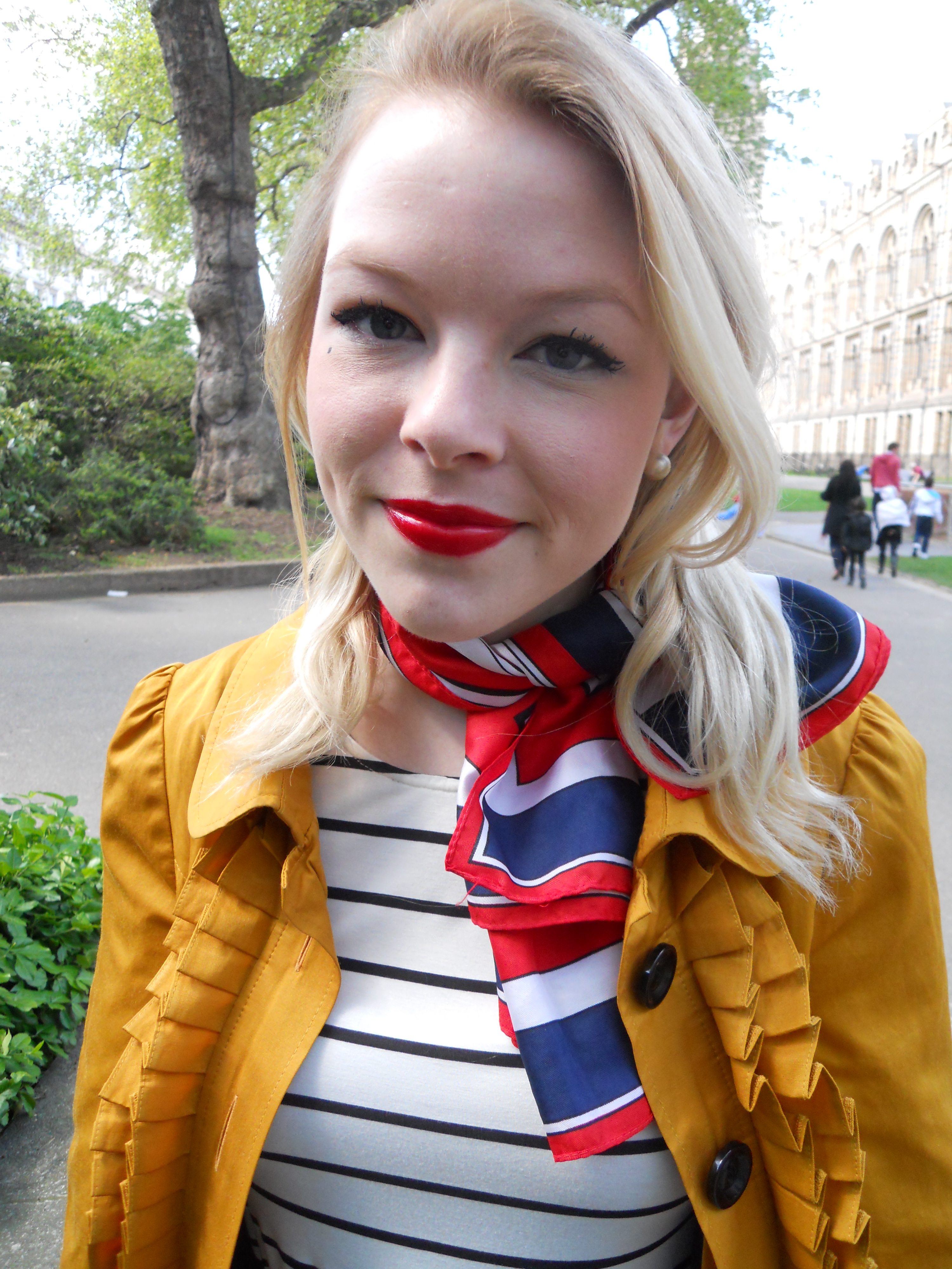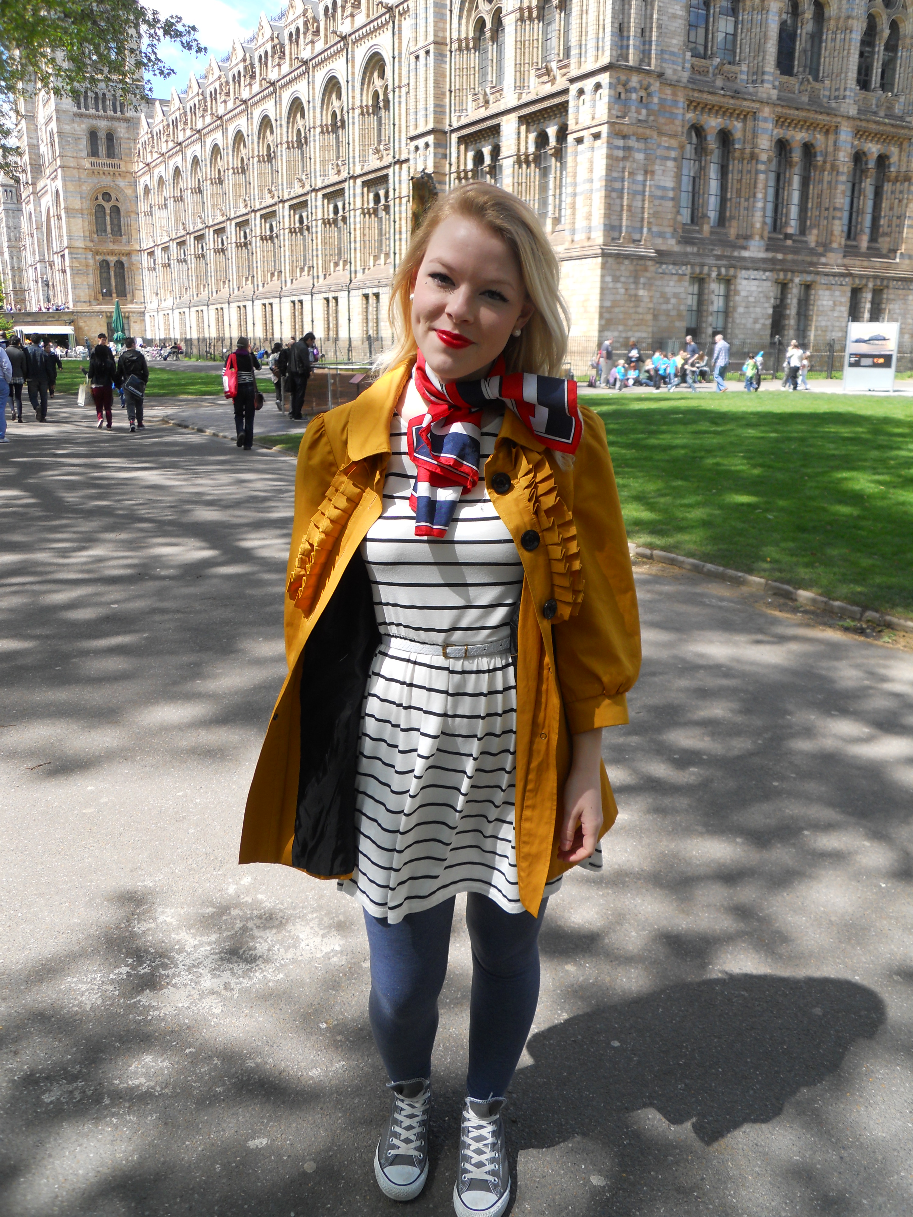 I’m wearing a Primark striped dress which was a steal at £10, and which is due to be part of an upcoming summer basics post. I accessorised with a vintage scarf that I believe I paid about £2 for many years ago in a vintage store in my uni town, and which I love for a nautical injection into any outfit. I paired my dress with Primark leggings, a River Island belt and my comfy converse, which I live in and layered this outfit over with my mustard coat from Peacocks just to add an extra fun dash of colour.