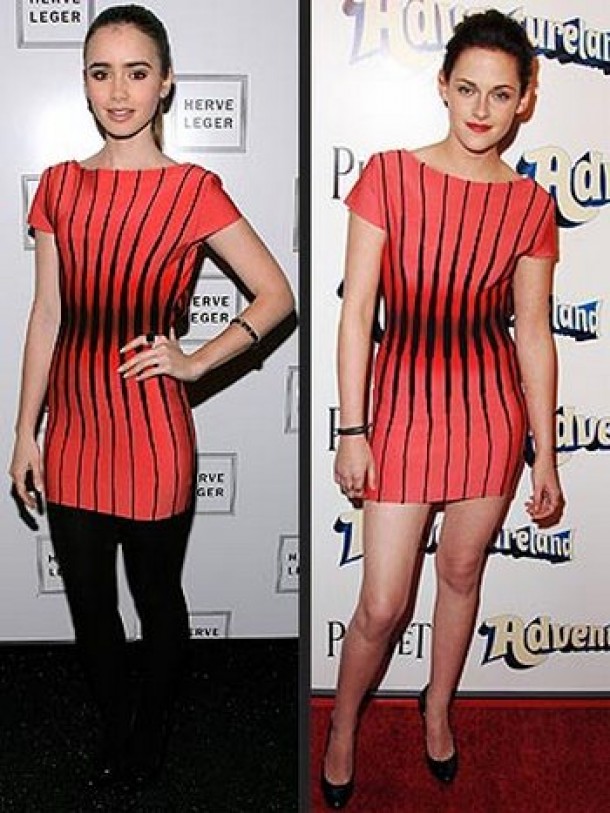 Here we have it, Kristen and Lily in the same Herve Leger by Max Azria dress, who’d have thought it? The girls both donned this dress in 2009 for two separate events, Lily for a Herve Leger event, and Kristen for an Adventureland premiere.
