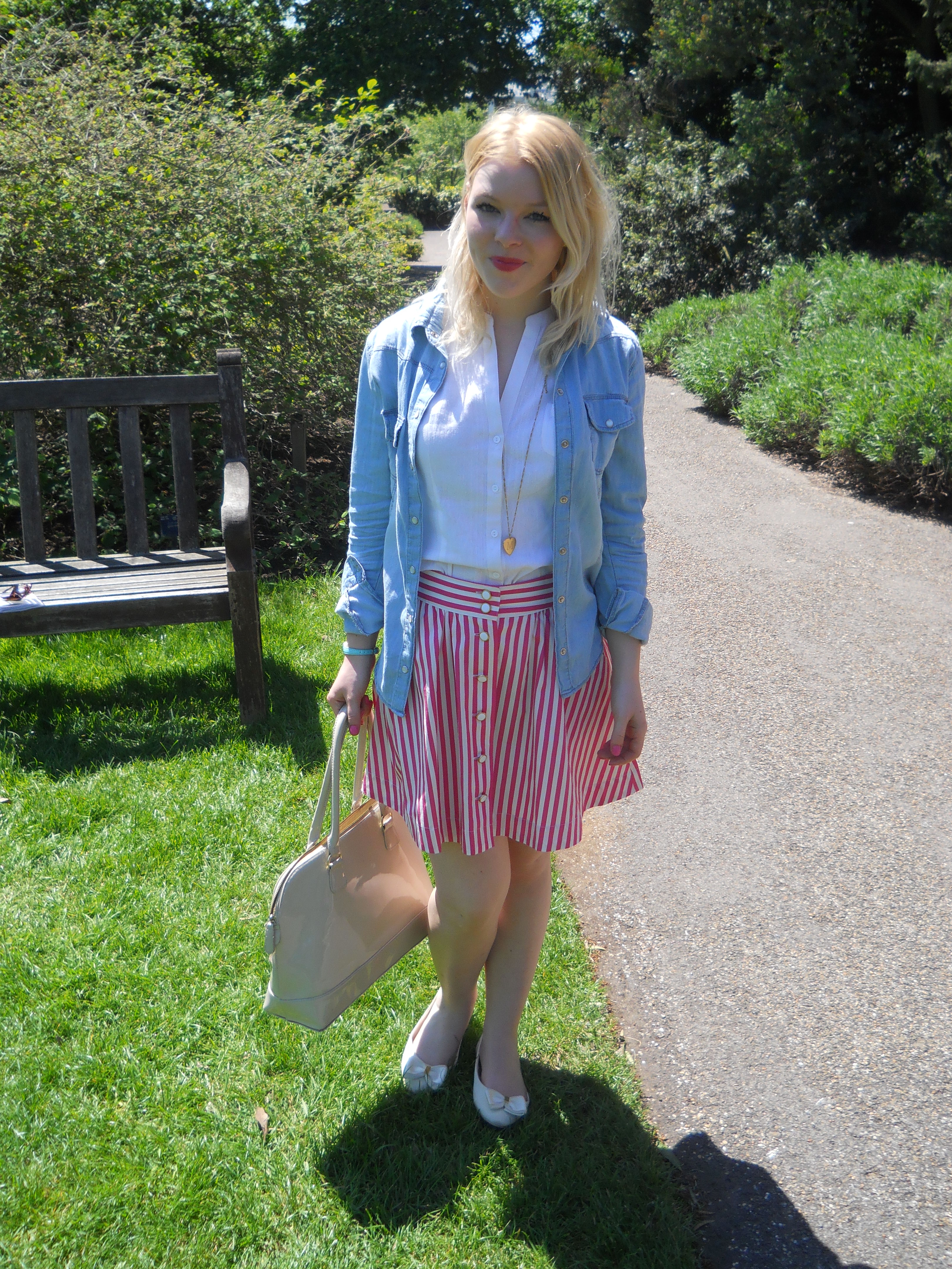 Being as it’s impossible to even think about trousers in heat like this, I opted for a cute Zara skirt that I picked up in the sale for £5.99 last year. This was the focal point of my outfit as I love its candy-cane stripes and sweet wrapper style colours. I paired it with a sleeveless Matalan shirt that I also picked up for a bargainous £5 last summer. For in the shade and when the sun goes in, I brought along my new favourite wardrobe piece, this denim shirt from Primark that is currently instore. For £10 it’s a steal compared to the abundance of these that are on the high street right now, and I saw an almost identical one in Pull & Bear which was double the price. I’m also wearing my ASOS watch and a cream Primark bag that I think is two years old and holding up fabulously!