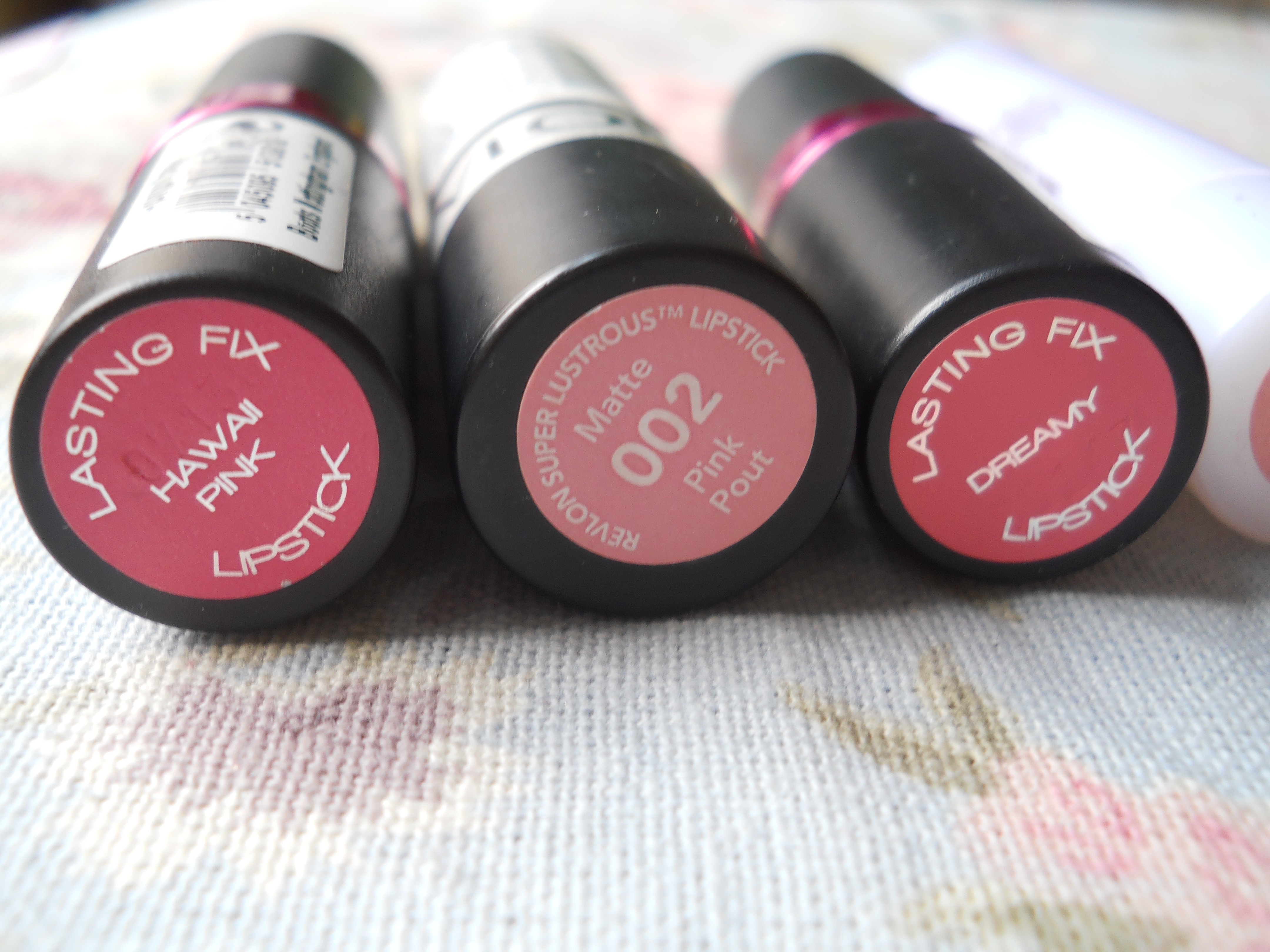 From left to right: Boots’ Natural Collection Moisture Shine lipstick in Candy Mist, Boots’ No. 17 Lasting Fix lipstick in Dreamy, Revlon’s Matte lipstick in Pink Pout, Boots’ No. 17 Lasting Fix lipstick in Hawaii Pink and Boots’ Natural Collection Moisture Shine lipstick in Rose Petal.