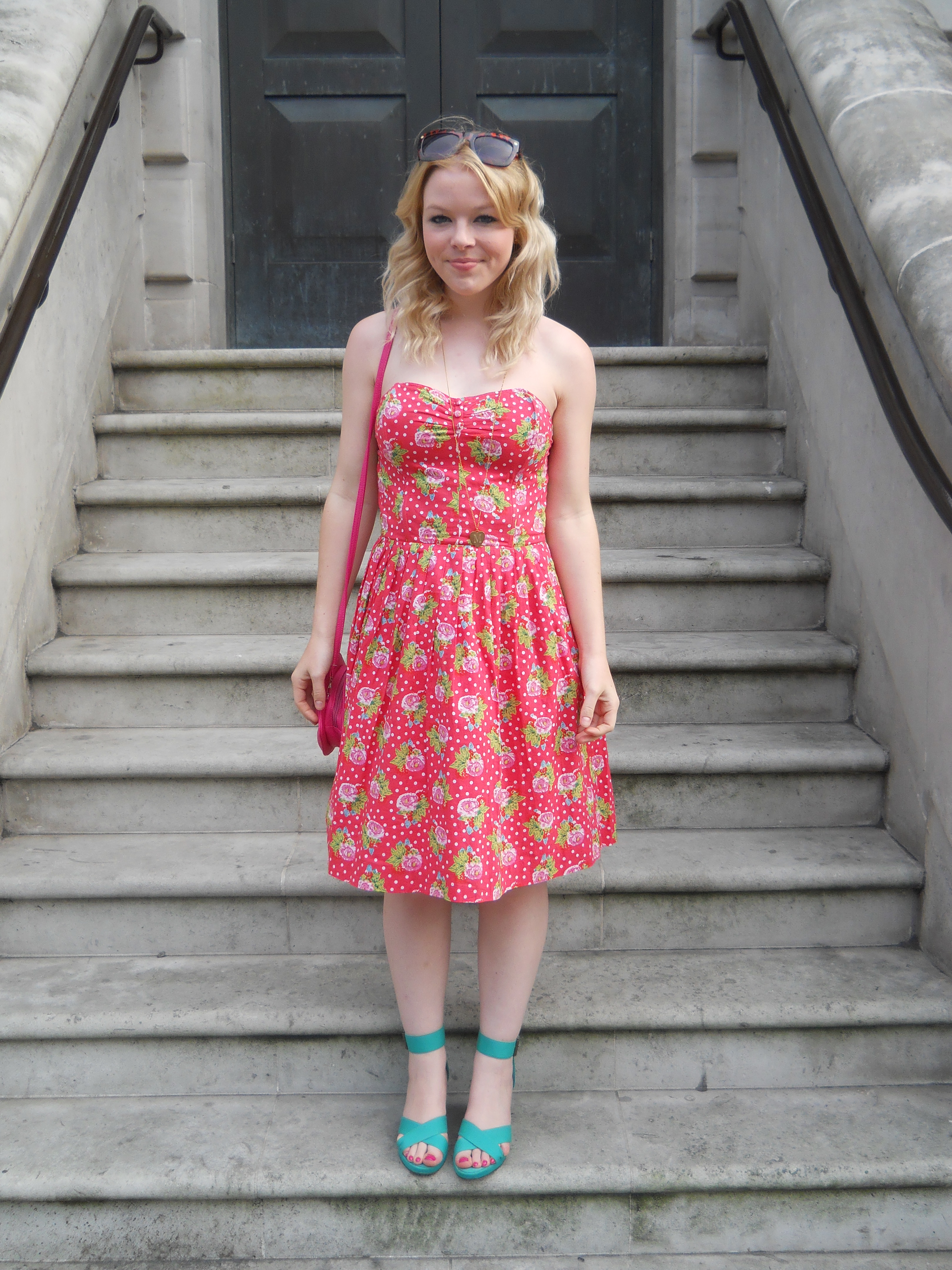 I’m wearing this cute floral and polka dot frock that I picked up a few years ago in TK Maxx. This is one staple dress that I wear to death come summer as it never really goes out of style and the classic shape means it’s always flattering.