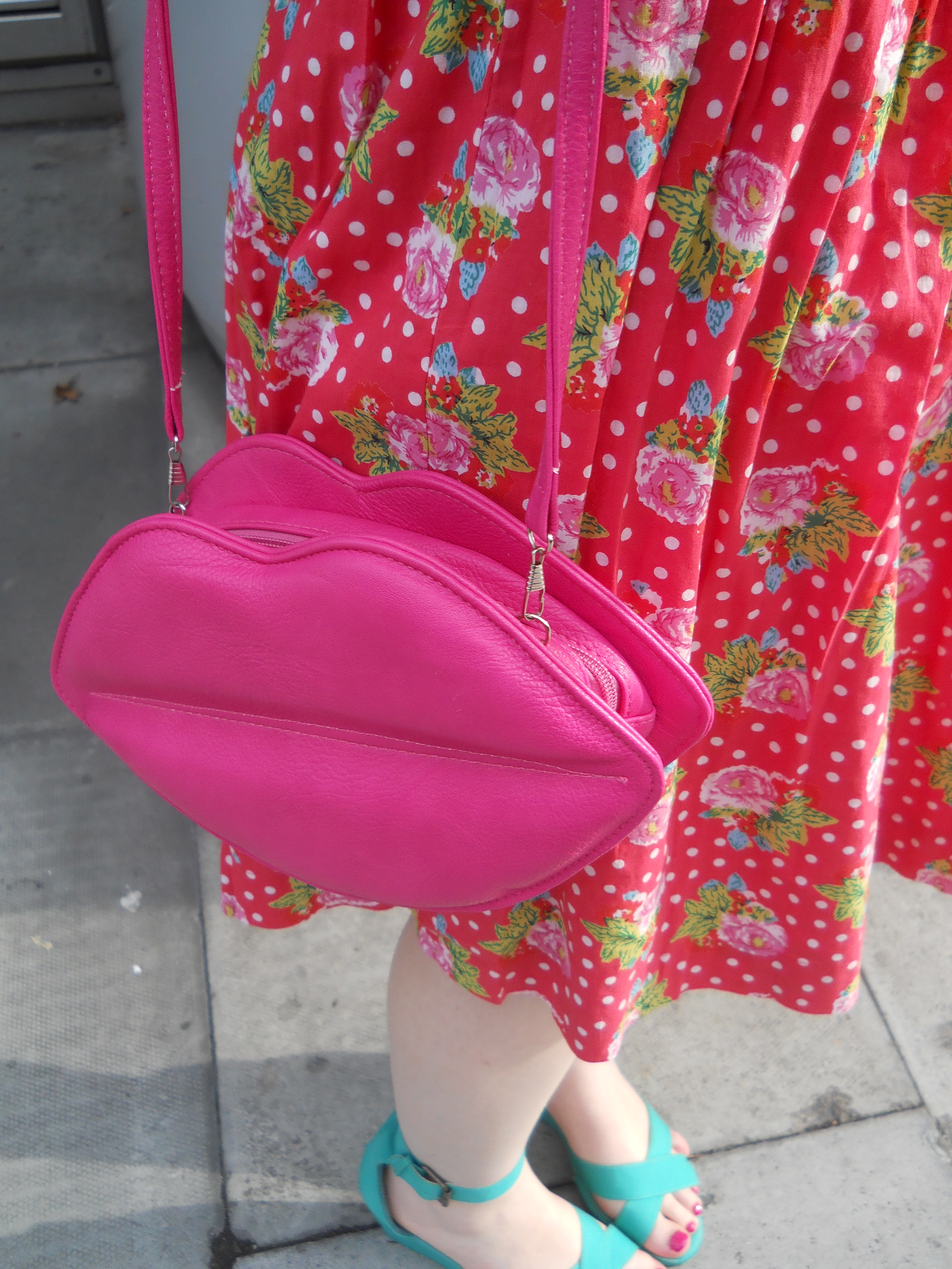 I teamed the bright dress with my pink lips clutch from Johnny Loves Rosie at ASOS. This gorgeous bag reminds me so much of the Lulu Guinness bags and can be worn as a clutch just like the originals too. I did a whole post on this bag a while back so I’ll link that here. Shoes-wise I opted for some H&M sandals that I also have treasured for many years as they’re super comfy and give you just enough height without being too dressy. The only piece of jewellery I wore was my faithful Urban Outfitters ‘M’ pendant which just adds a little more personality to the outfit without detracting from the print and statement bag. The sunglasses are H&M and are instore now and for those wondering my toes are painted with one of my all time favourite polishes Barry M’s Shocking Pink.
