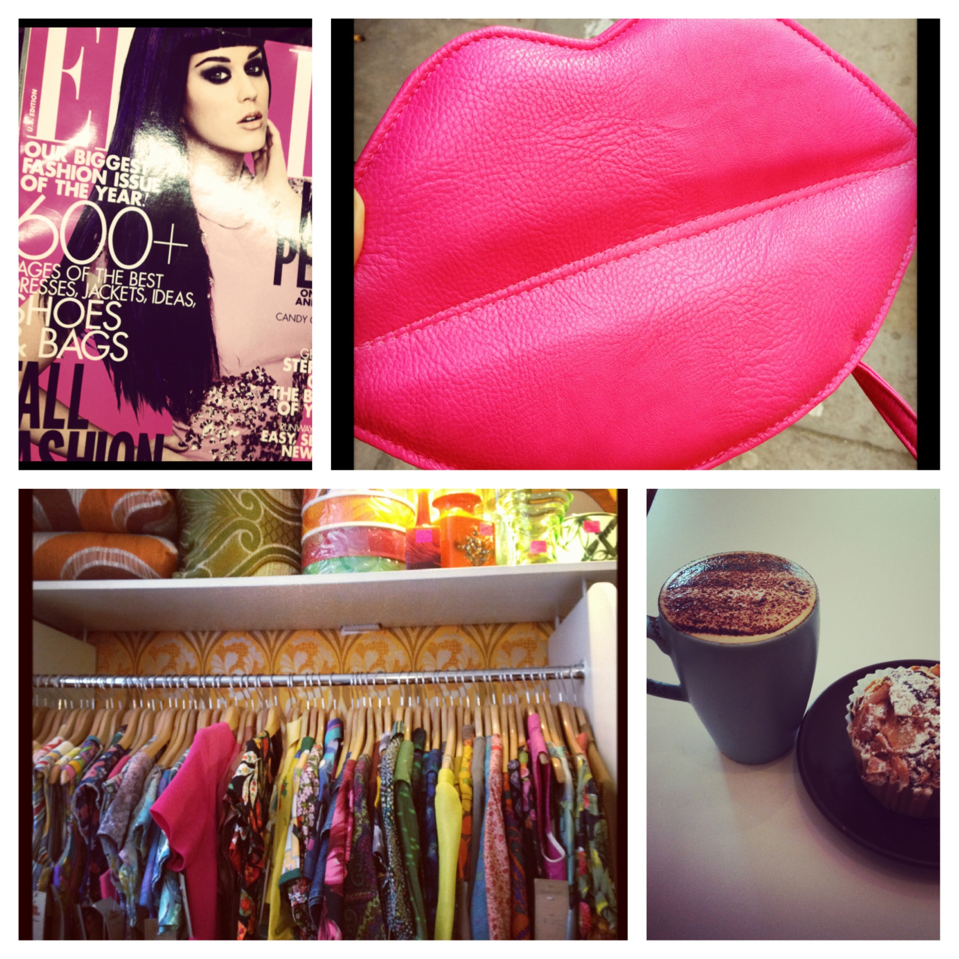 1. Finally finding the Katy Perry US Elle 2. The Johnny Loves Rosie Lips Clutch 3. Vintage store Pop in Covent Garden 4. Cappuccino and a Coconut and Chocolate Muffin at the Wellcome Gallery Cafe.