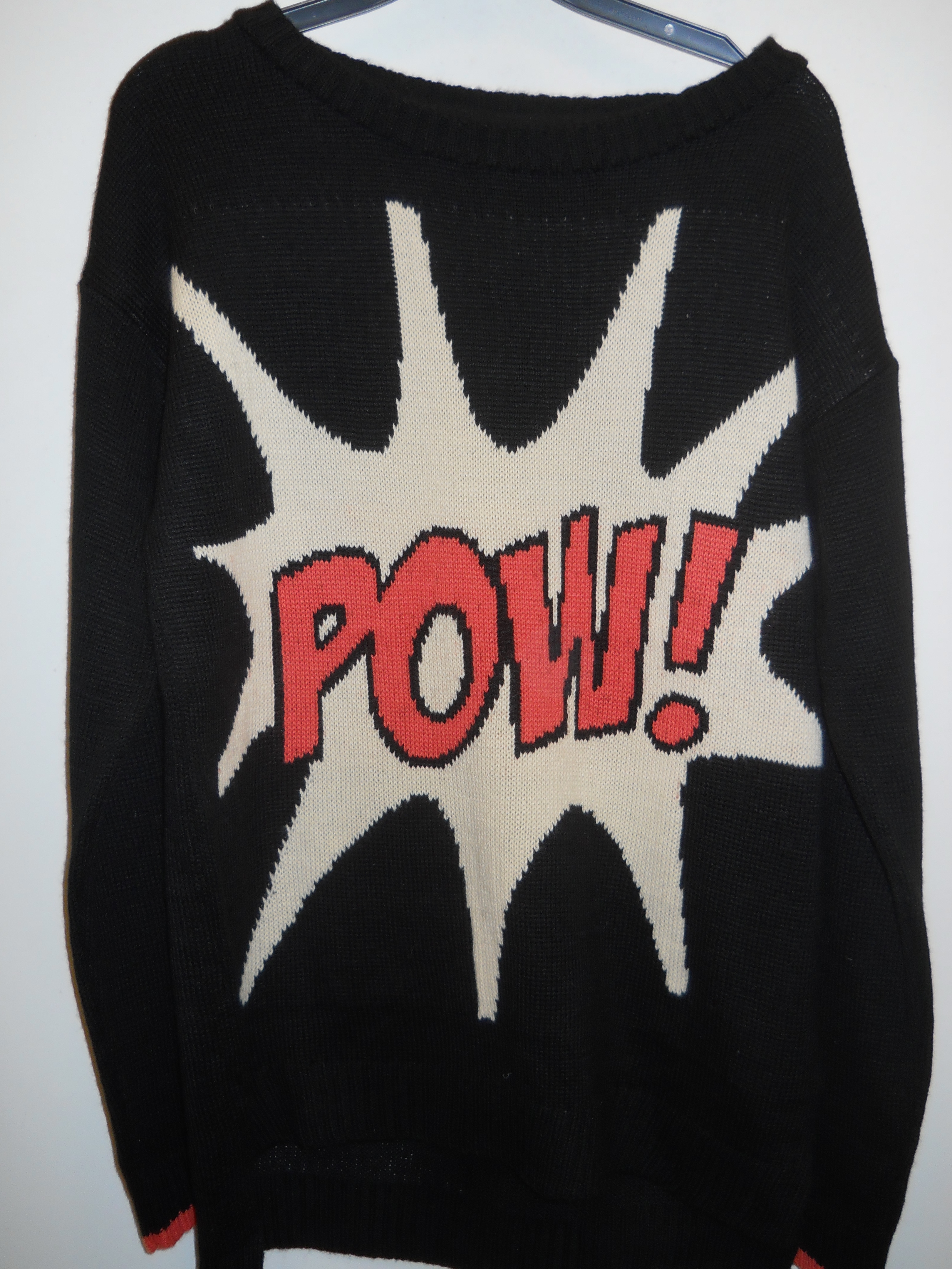 The second jumper, which is more of a jersey material, features more traditional comic book colours and instead of a ‘pow’, this time it’s a ‘boom’. This is the perfect lazy day jumper and is light enough that you can start wearing it now and it’ll see you through to spring. I’d pair this with a cute skirt and shoe boots to keep the look feminine against the more masculine graphic. What’s better? This one’s only £10 too!