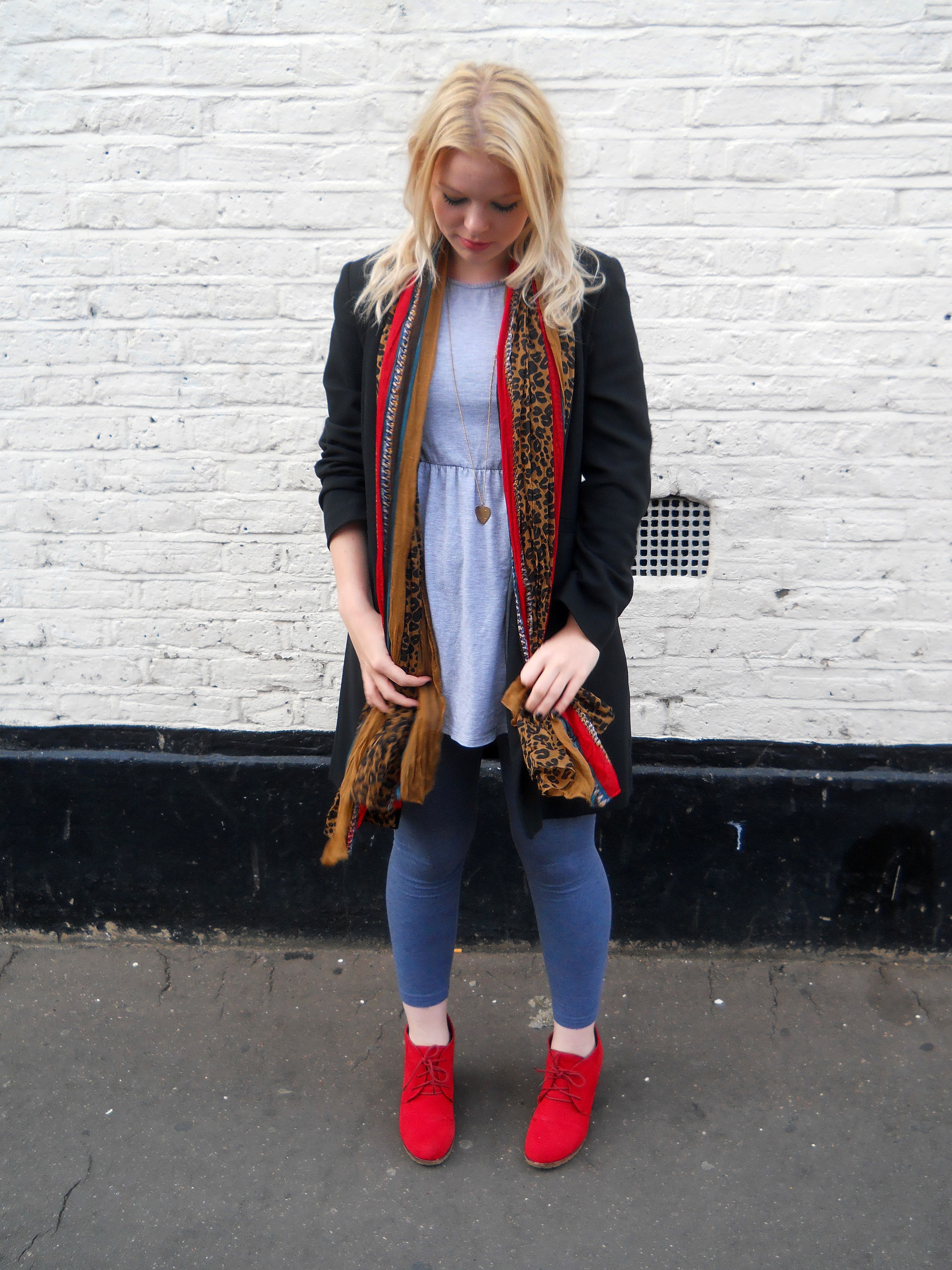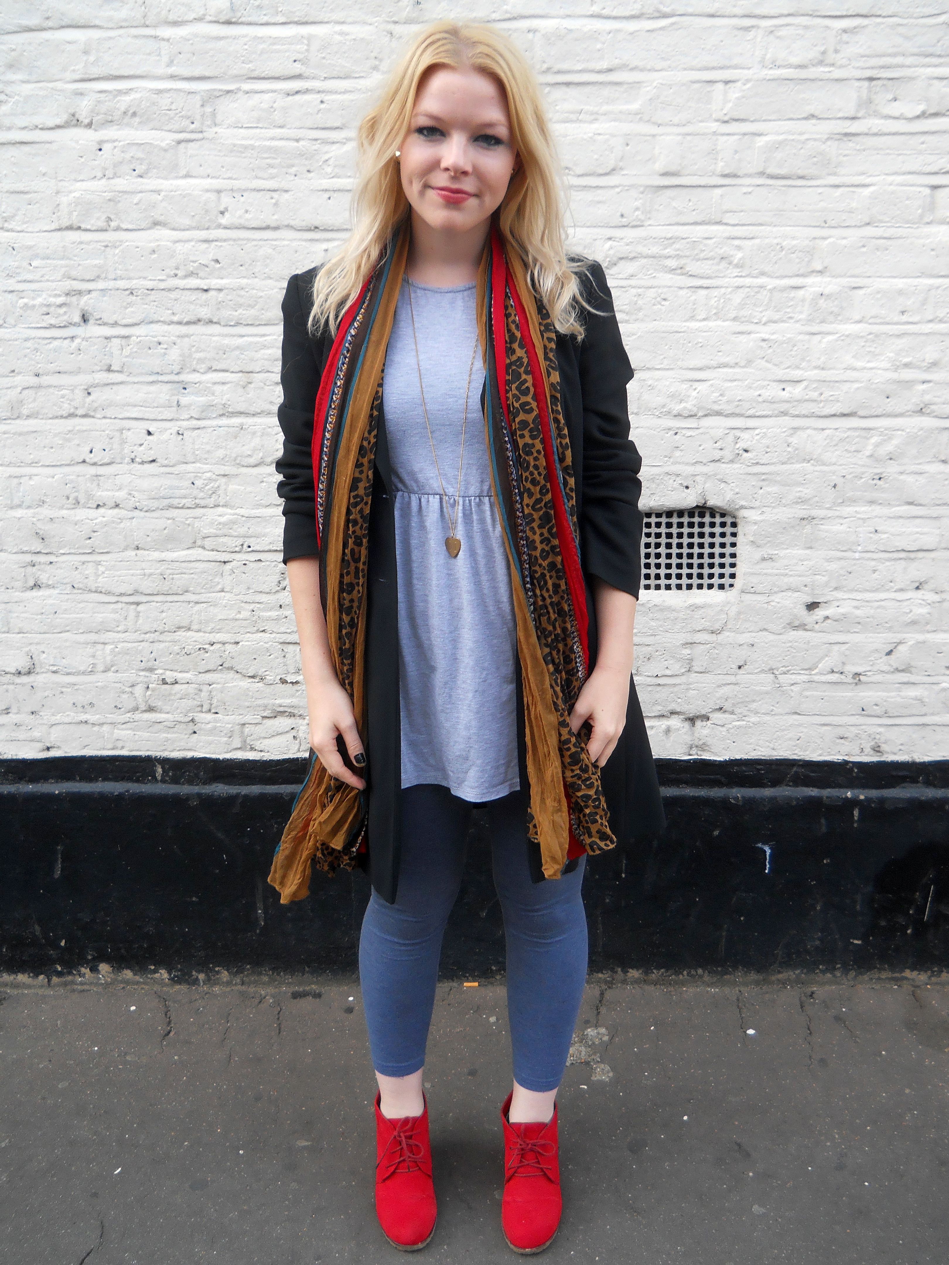 To keep the look easy despite the different colours, I opted for more muted base colours, like grey, black and an almost denim blue. My grey dress which is one of my all-time wardrobe staples, was a lowly £10 from Primark, and I believe they still have these available in some stores. This is the easiest dress to throw over leggings when you want to let your other accessories do the talking. My leggings are also from Primark and I love the shade of these, they’re not quite light blue and neutral enough to wear with most colours as an alternative to black. The coat, which I’ve mentioned in quite a few OOTDs at the moment, is vintage and was gifted to me by a neighbour in my hometown and I honestly don’t know where I’d be without it now!