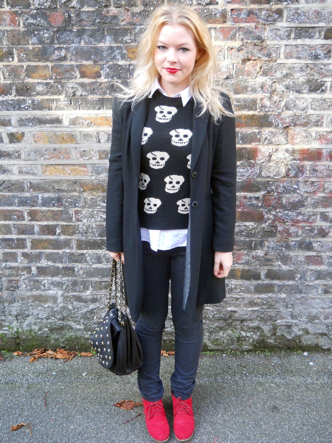 As I mentioned, I picked up my jumper from Missguided, but there are tonnes of these on Ebay, so check out this link here to search through. I love how unashamedly bold this jumper is and monochrome is a big trend for autumn/winter (as well as skulls themselves of course!) I teamed my jumper with my polka dot Matalan jeans and kept things simple with my skull bag from Max C London and my Timeless wedge boots in a bold red. To make this outfit warmer I layered a white Primark shirt underneath the jumper for a more preppy look and threw my oversized vintage blazer style coat over the top. Finally to stick to the colour scheme I went for Maybelline’s Colour Sensational lipstick in 530 Fatal Red on my lips, which is hands down my favourite red lipstick in the world. But what do you think of the spooky ensemble?