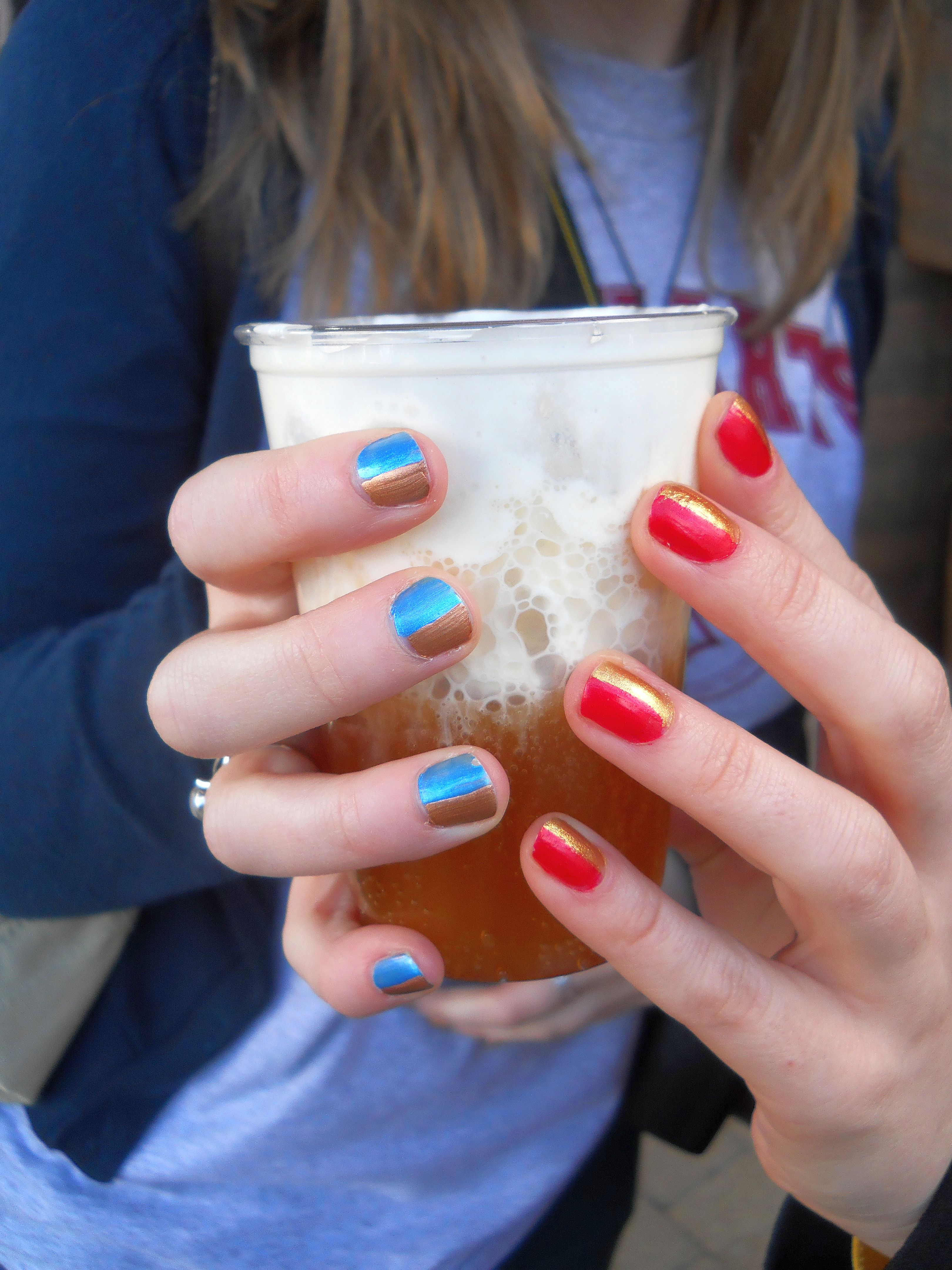 My best friend and I painted our nails according to the house we believe we should be in. My nails on the right are painted with Rimmel’s Red Carpet and Models Own Gold Rush to fit the Gryffindor theme and Hannah went with Ravenclaw. And yes, if you were wondering that is Butterbeer we’re holding!
