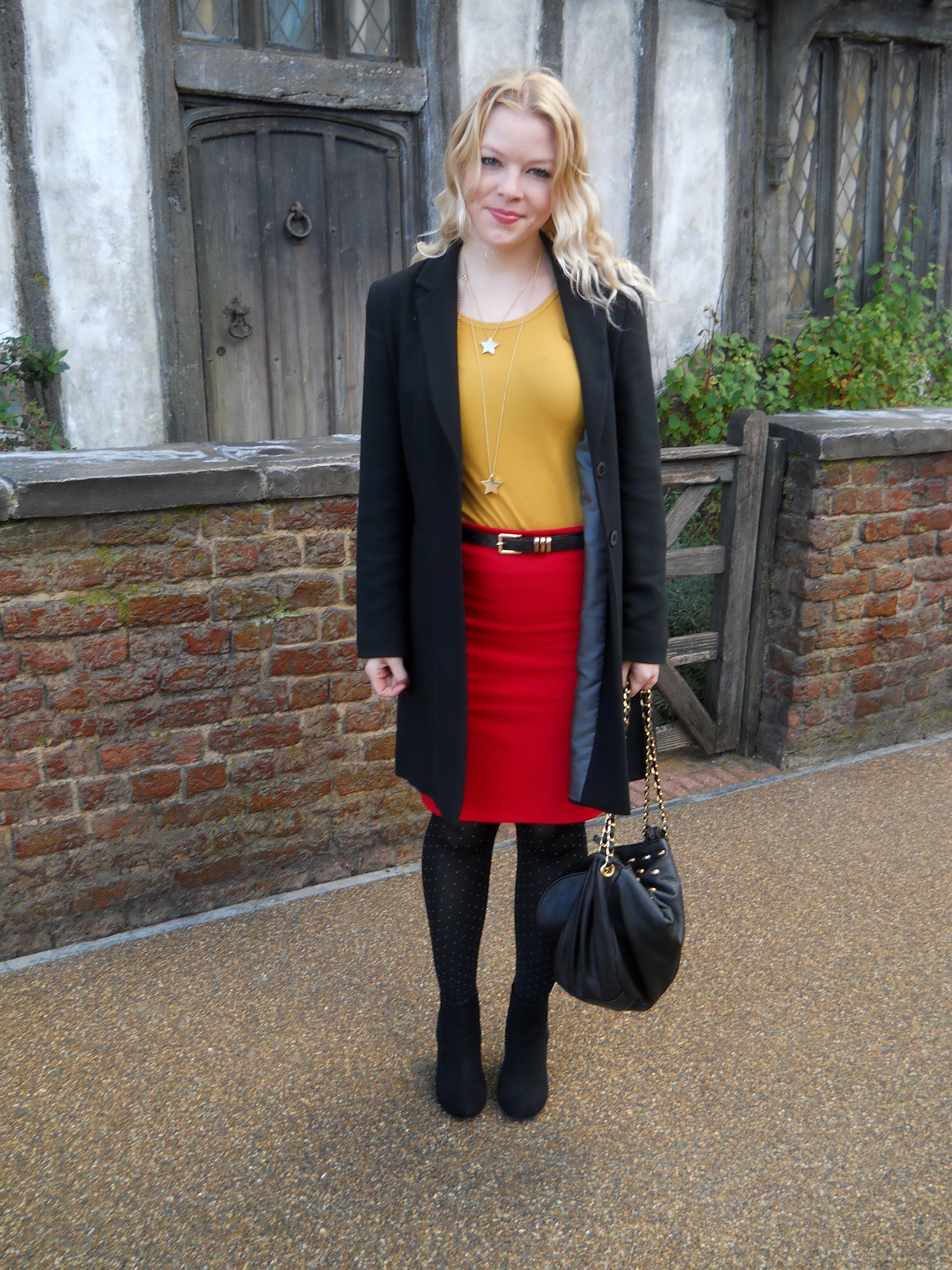 I wore the house colours of red and mustard along with some gold to really set off the outfit. I started with this simple long-sleeved tee from Dorothy Perkins and paired it with a Zara tube skirt in a bright red. I wanted my outfit to represent the house, but I still wanted to look mature, as I certainly wasn’t acting my age when I got in there! I threw over my vintage blazer-style coat so as not to detract from the colours and also put on a pair of dotty opaques from Primark for a bit more whimsy and youthfulness.