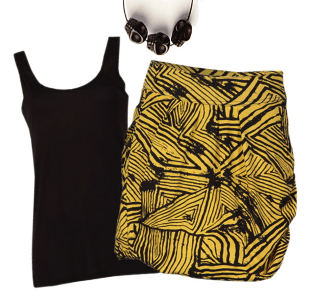 This look works the ethic-vibe with this tribal style skull necklace, and uses black as a base colour so the outfit doesn’t overhwelm. Perfect for a beach party or a summery day of sightseeing, this is definitely one of my favourite looks from today and you could easily implement your personal style by teaming it with ankle boots or even make it a little more formal with a black blazer for a city-chic look. The simple vest is from Vero Moda and is only £5.99, while the skull necklace is a steal at £2.99 from Pieces. You can find and shop all these items at Get The Label, and this outfit will set you back less than £15! You can shop the skirt here, the vest here and the necklace here.
