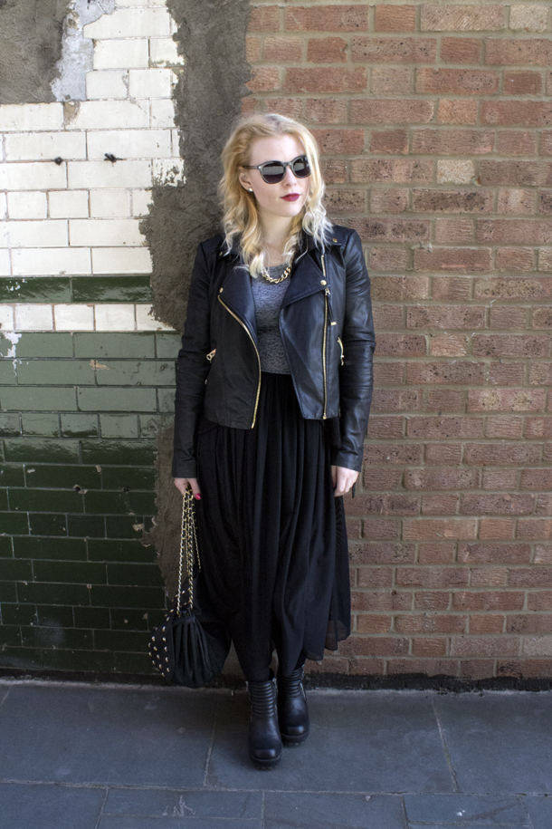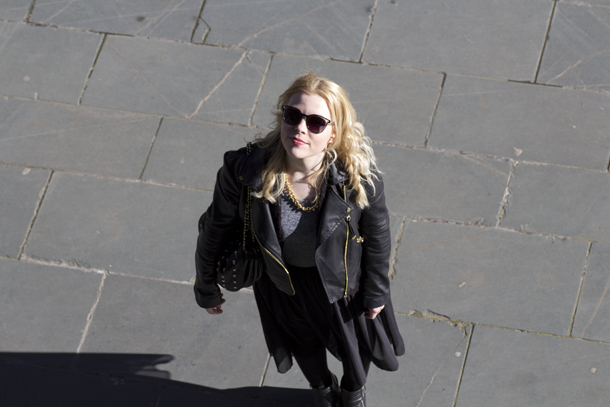 On this particular day, I opted for a gorgeous dress from Matalan as the base of my outfit. I picked this up for just £15, but it’s now £10 in the sale, here. I can’t rave about this enough because it’s super flattering and the fabric feels so much more luxe than you’d expect. Over the top I threw an Urban Outfitters cocoon cardigan that I got in the sale (just visible), and my beloved faux leather biker from Mango. To keep the look more tough against the girly shape of the dress, I went for my H&M chain, my Forever 21 sunnies and my clunky H&M boots which I love to death. My bag as usual (I can’t bear to part with it) is an old friend from Max C London.