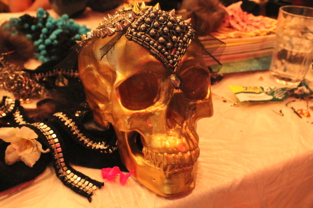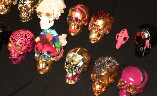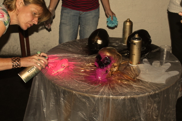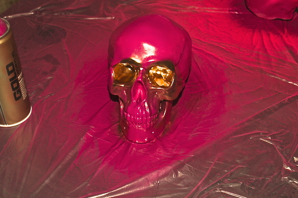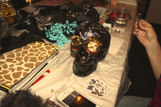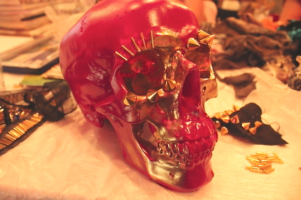 I opted to spray paint my white skull with a dark pink colour, and the spray paint station was set up ready for whatever paint job we had in mind. I then sprayed the eyes of my skull gold and let the paint drip down onto the front of the cast. I wanted to go for something edgy and spike-themed, so next it was over to the embellishment table to do some detail work. The materials on hand were massively wide ranging, and the fact that every single person’s skull came out 100% differently is a testament to the range of materials on offer.